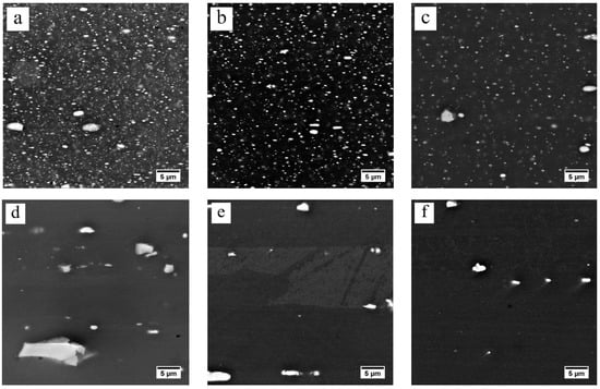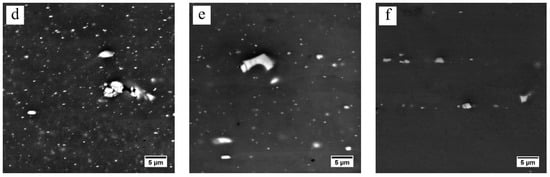 During heating from room temperature to 300 °C, the slight decrease in EC for the FH samples indicates that little dissolution has occurred. The larger reduction in EC for the SH sample indicates that more η phase has dissolved, compared to the FH sample. However, the SEM observations of the FH sample, as shown in Figure 7a, and the SH sample, as shown in Figure 8a, quenched after heating to 300 °C, show that both the FH and SH samples have a large number of precipitates left. When the temperature goes up from 300 to 450 °C, the EC values of both the FH and SH samples in Figure 6 decrease rapidly. For example, the rapid heating reduces the EC value from 45.3% IACS at 300 °C to 34% IACS at 450 °C within ~2 min. The SEM-BSE images in Figure 7b–d and Figure 8b–d clearly show a rapid dissolution of the η particles during the fast and slow heating, which is consistent with the change in EC. Figure 7d shows that a few η phases were left after rapidly heating to 450 °C. However, very few η particles remained in the SH sample quenched at 450 °C, shown in Figure 8d, leading to a lower EC value. For both FH and SH samples, the EC decreased slowly in the following heat-up from 450 to 475 °C and the 1 h soak at the solution treatment temperature (475 °C). The SEM-BSE images in Figure 7d–f and Figure 8d–f show that the η phases continue to dissolve into matrix. However, the SEM-BSE images of the SH samples in Figure 8e suggest that the η phases are almost dissolved before the holding process. It should be noted that, during heating, the EC values of the FH samples were always higher than the values of the SH samples. After solution treatment, similar EC values were found in both the FH and SH samples.