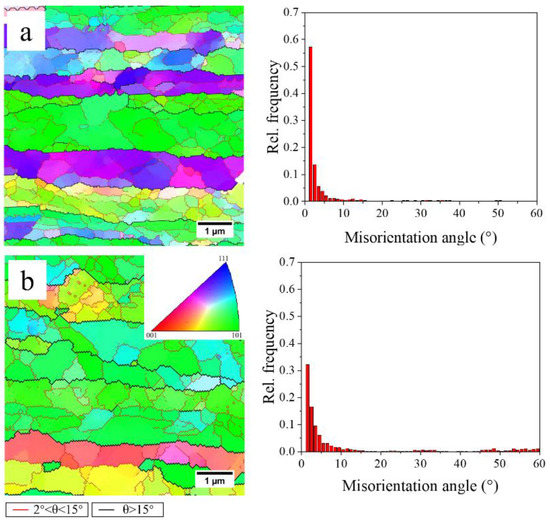 Figure 9. The EBSD maps and corresponding histograms of the misorientation angle distribution of samples quenched at 300 °C (a) FH, (b) SH.