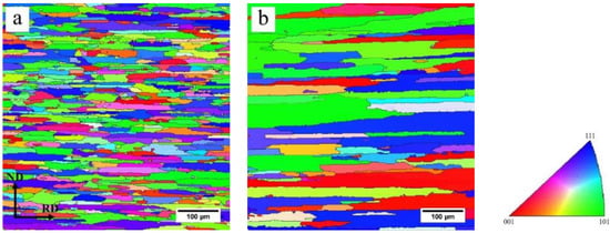 Figure 10. EBSD maps of samples after solution treatment; (a) FH, (b) SH, 50 °C/h.