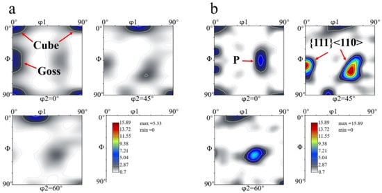 Figure 11. ODF maps (0°, 45° and 60°) of samples after solution treatment (a) FH, (b) SH.