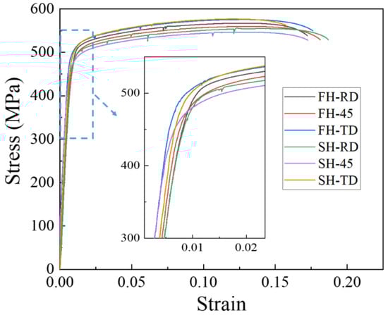 As the tensile curves of the three tests for every condition coincided with each other, the average strengths were calculated and are listed in Table 4. One of the stress–strain curves of the FH and SH samples, tested along RD, 45° from the RD and TD after artificial aging (T6), are shown in Figure 12. The inset figure in Figure 12 shows the elastic deformation stage with the yield point zoomed. The r-value and Δr were calculated according to the equation: