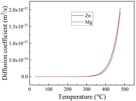 The dissolution of the η phase during the solution treatment is controlled by the diffusion temperature and time, which are related to the heating rates. The diffusion coefficients of Zn and Mg elements change with the temperature during the heating process, as shown in Figure 13.