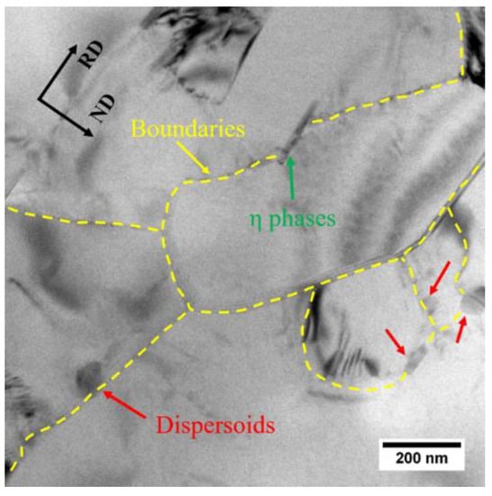 The elongated grains, shown in Figure 10, as well as the Cube, Goss, P and {111}<110> textures, shown in Figure 11, were observed in both the FH and SH samples after solution treatment. It has been reported that these kinds of structures are usually observed in aluminum alloys when the concurrent precipitation of dispersoids occurs during heat treatment [33,34]. As discussed above, however, the dissolution of η particles, rather than concurrent precipitation, occurs during the solution treatment, even at the slow heating rate. The elongated grains and textures can be attributed to the pinning effect of the dispersoids formed during homogenization and the undissolved η particles on the migration of the (sub)grain boundaries. In order to confirm this, the TEM observation was performed on the FH sample quenched at 300°C and the image is shown in Figure 14. The dispersoids and η particles are marked with red and green arrows, respectively. The η particles in Figure 14 have a needle-like shape with the longitudinal direction parallel to the RD. This shape results in a different pinning force on the migration of the (sub)grain boundaries along the RD and ND, helping to form the elongated grains. Dispersoids are insoluble and provide a constant pinning force to the (sub)grain boundaries during recovery and recrystallization. Figure 14 shows a smaller size of some of the dispersoids than that of the η particles, so the dispersoids are considered to be more effective in pinning the (sub)grain boundaries. The TEM observation of the solution treated sample, as shown in Figure 15, shows that the dispersoids are aligned in the RD. The difference of the pinning force on the migration of the (sub)grain boundaries, along the RD and ND is enhanced by the dispersoids. The migration of the (sub)grain boundaries along the ND is strongly blocked by the dispersoids and η particles, while the (sub)grains can easily grow along the RD. Thus, the elongated grains were produced after the solution treatment at both fast and slow heating rates.
