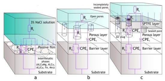Equivalent electrical circuits used for the impedance spectra analysis: (a) Al-Cu-Mg aluminum alloy, (b) plasma electrolytic oxidation (PEO)-coating, (c) composite coating.