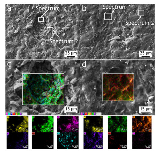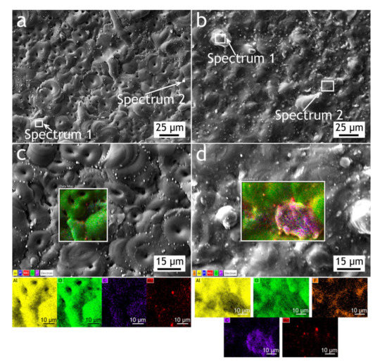 SEM images and EDX maps of the PEO-coating—(a,c) and composite coatings (CC)—(b,d).