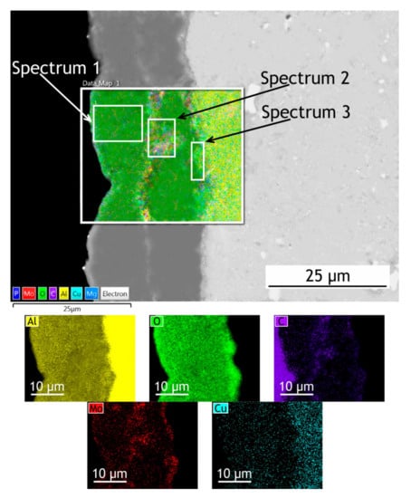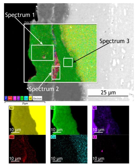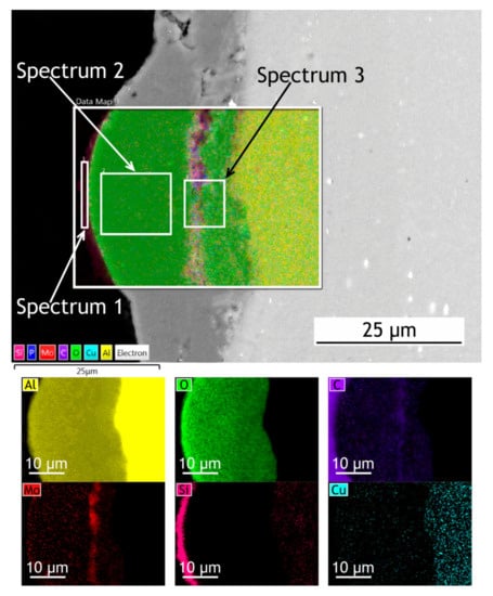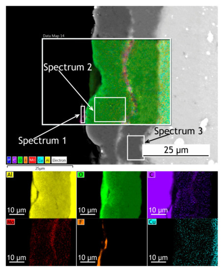 After atmospheric exposure of PEO-coating, we see little changes in the overall chemical composition (Table 6, Figure 11), compared to the specimen before exposure (Table 2). As for the composite coatings’ cross-section, we also do not see many changes (Figure 12); there is a distinct fluorine-containing layer, which means that polytetrafluoroethylene is present in the top layer of the coating. At the top of the coating, fluorine content is up to 20.9 wt. %. We see high molybdenum content (3.9–4.9 wt. %) for both PEO and composite coatings in the middle part of the coating. These results indicate that there is no degradation of the coating material during atmospheric exposure.