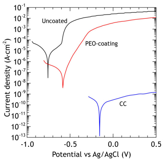 Potentiodynamic polarization curves obtained in 3% NaCl for the bare alloy, PEO and composite coatings.