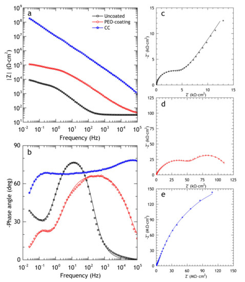 Impedance data obtained in 3% NaCl for the studied samples. Bode—(a,b) and Nyquist plots for the bare alloy (c), PEO (d) and composite (e) coatings.