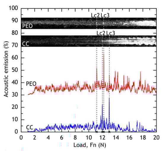 Micrograph of a full scratch, critical loads, and acoustic emission of PEO and composite coatings.