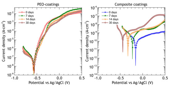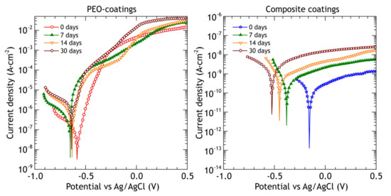 The samples were withdrawn after 7, 14, 30 days of atmospheric exposure and electrochemical impedance spectra and potentiodynamic polarization curves were recorded on at least three different samples. Potentiodynamic polarization curves of PEO and composite coatings before corrosion testing and after 7, 14 and 30 days of atmospheric exposure are shown in Figure 13, and the calculated electrochemical parameters are presented in Table 7.