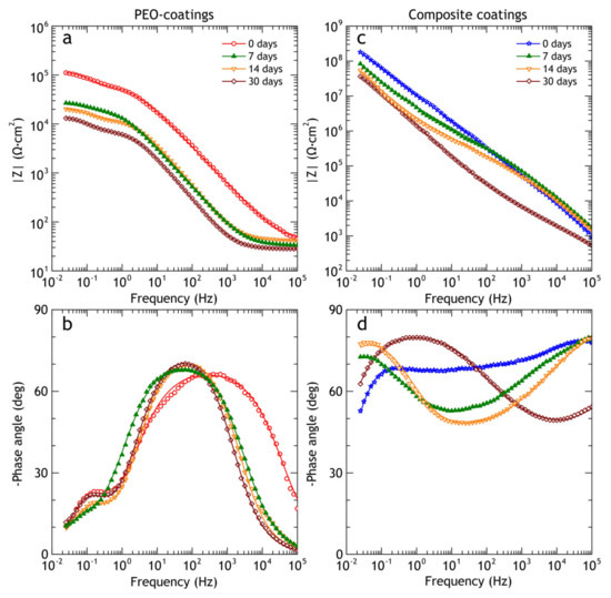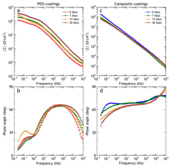 Bode plots obtained in 3% NaCl for PEO (a,b) and composite coatings (c,d) before and after 7, 14 and 30 days of marine immersion.
