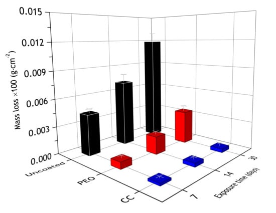 During the atmospheric corrosion, the corrosion spots appeared at the surface of the bare aluminum alloy, and the maximum mass loss was registered for these samples, while coatings significantly reduced the mass loss (Figure 15). The observed discrepancy of results obtained for the bare alloy in comparison to the coated samples is affected by the fact that corrosion products were removed from the bare alloy by pickling. Si was detected at the PEO-coating’s surface region. Presumably, it originates from the atmospheric dust incorporated into the pores. Nevertheless, according to obtained results, its content is insufficient to lead to mass gain. In the case of the CC—its pores are almost completely sealed with the polymer and it shows no signs of silicon and a noticeable change of mass. The mass loss is associated with removing corrosion products from the surface of the coated samples being thoroughly washed before weighting.