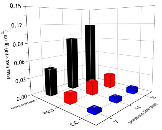 Mass loss of bare alloy, PEO and composite coated samples after 7, 14 and 30 days of marine immersion.