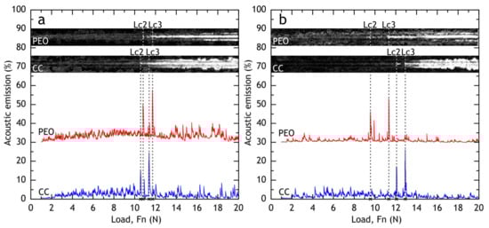 Micrograph of a full scratch, critical loads, and acoustic emission of PEO and composite coatings after 30 days of atmospheric exposure (a) and marine immersion (b).