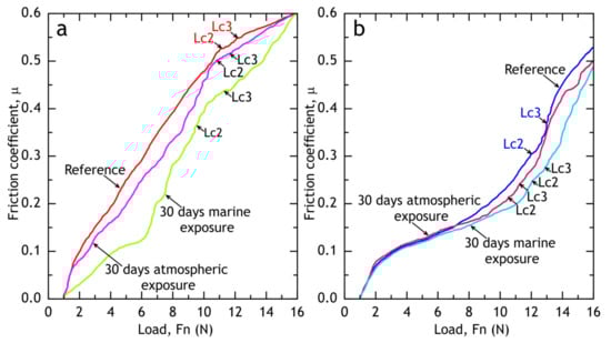 PEO (a) and composite (b) coatings’ friction coefficients after atmospheric exposure and marine immersion.