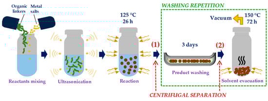 However, solvothermal synthesis undeniably exhibits some shortcomings, such as the use of expensive stainless steel autoclaves and Teflon reactors, environmental hazards with the use of solvents, limitation of mass production per synthesis, and difficulties of product washing processes []. The latter involves the use of solvents such as dimethylformamide, diethylformamide, acetonitrile, acetone, ethanol, and methanol, where the mixtures of solvents have also been used in many cases to avoid problems of different solubility for the different reactants []. The chemical reaction takes place between inorganic and organic components leading to the formation of frameworks of the material contoured by the solvent molecules that act as a “pore template”, and will be removed during washing and evacuation processes at high temperatures []. Depending on the operation conditions, the processes may involve the blockage of pores due to the incomplete removal of reactive medium from MOF product such as the solvents of reaction, residual reactants, and side products [].