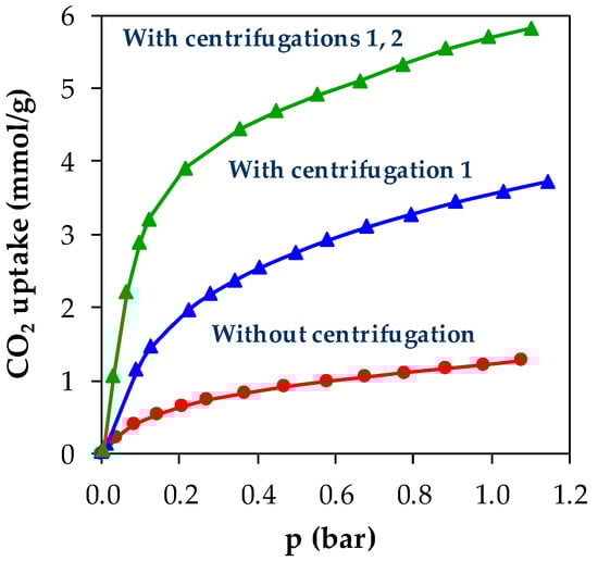 For the second-batch synthesis, centrifugal separations were introduced at two different points as shown in Figure 1 with the aim of: (1) Removing the reactive medium from the MOF powder after the reaction, and, (2) separating the polluted methanol from the MOF powder after the product washing. Two Ni-MOF-74 samples were synthesized in the second-batch synthesis; one was prepared with the addition of centrifugation 1 and another one with centrifugations 1 and 2. The effect of centrifugal separations on the pore activation of the MOFs was then assessed by performing CO2 adsorption measurement in a pressure range of 0–1.2 bar and at 25 °C. The results were presented in Figure 2 comparing the isotherm of the first-batch sample with washing repetitions (red). At 1 bar, the second-batch samples display higher CO2 uptake with 3.70 mmol/g for centrifugation 1 (blue) and 5.80 mmol/g for centrifugations 1 and 2 (green). The final value is comparable to the above-mentioned literature data. It shows that the introduction of the centrifugal separation technique to the synthesis routes at two points has evidently improved the separation in the washing processes.