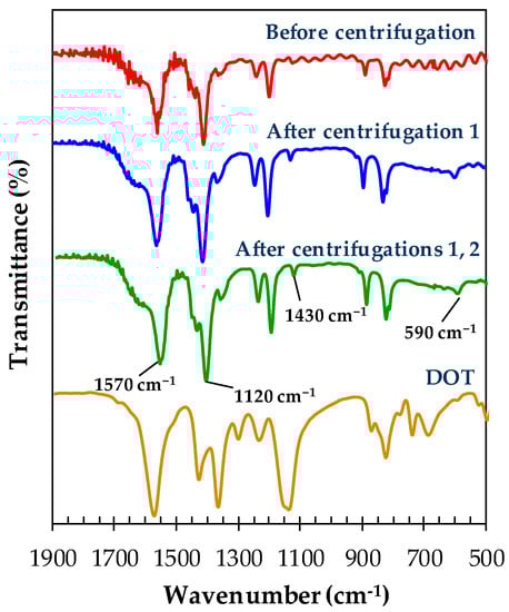 The characterization of materials was carried out using FTIR to analyze the organic chemical structure of the samples as a function of centrifugal separation as presented in Figure 3. The red, blue, and green spectra represent the reaction products before centrifugation, after centrifugation 1, and after centrifugations 1 and 2, respectively. All samples have the same characteristic peaks of symmetric (1570 cm−1) and asymmetric (1430 cm−1) stretching vibrations of carboxylate groups [], which are the functional groups of DOT linkers that act as organic fragments in Ni-MOF-74. All samples also exhibit characteristic peaks in 1370–1000 cm−1 and 1000–500 cm−1 regions assigned for in-plane and out-of-plane C-H bending vibrations, respectively []. By applying the same resolution and condition of acquisition of the analysis, it is noticed that the green and blue spectra produce peaks with higher intensities whereby the intensity in FTIR spectroscopy is directly proportional to the concentration of molecules of interest in a sample []. The equation that relates concentration to absorbance is known as Beer’s law which is presented below []: