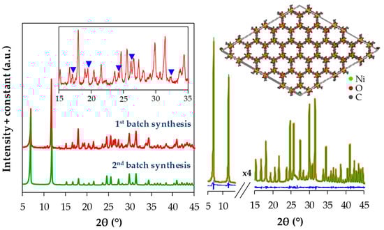 (left) Powder X-ray diffraction (PXRD) patterns of Ni-MOF-74 samples from the first-batch synthesis (red) and the second-batch synthesis with centrifugations 1 and 2 (green). (right) Results of Rietveld refinement on the second-batch sample; green, yellow, and blue lines represent experimental data, indexed reflections of molecular structure of Ni-MOF-74, and difference plot, respectively.