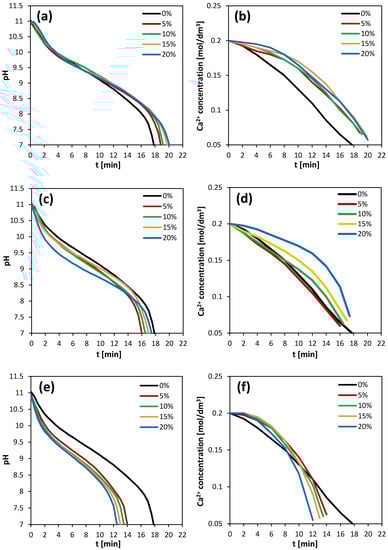 pH and Ca2+ concentration curves versus time for DMSO (a,b), methanol (c,d) and isopropanol (e,f) depending on the solvent concentration.