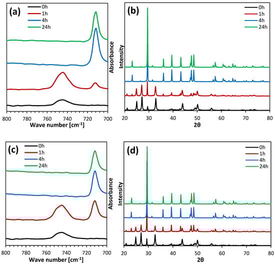 In the fingerprint range, characteristic peaks for vaterite and calcite are visible at around 745 and 713 cm−1 wave numbers, respectively. However, characteristic vibrations for DMSO should occur at around 1040 cm−1, and for alcohols they should occur at around 3200–3500 cm−1. No peaks were observed in the recorded ATR-FTIR spectra in these ranges (Figure S4). Thus, the produced dried calcium carbonate did not contain residues of organic solvents. Based on the XRD data, the percentage content of vaterite (XV) was calculated using Equation (2) [41],