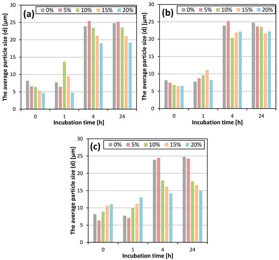 All the particle size distributions had a similar bimodal course. The first maximum was observed between 0.5 and 0.8 mm, while the position of the second maximum shifted towards higher diameters as the incubation time increased. The relationship between the concentration of the organic solvent and the mean particle size is shown in the Supplementary Materials (Figure S6). For the control sample and all the concentrations of the tested solvents, no significant difference in the average particle size was observed for the samples that were incubated for 4 and 24 h. The influence of additive concentration on average particle size was evident within the first 4 h of incubation (Figure 3). By comparing the sizes of the particles that were separated from the reaction mixture after 4 and 24 h of incubation, the largest increase in particle size occurred when particles were left in a solution without organic additives. In contrast, the smallest increase in crystal size was observed for particles that were incubated in 15% and 20% isopropanol solutions.