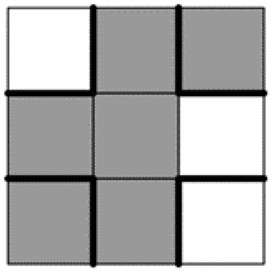 Now, the considered synthetic cluster in the form of a quasi-rectangle is modified according to some rules. To find the so-called central black pixel, we randomly select a black pixel belonging to the surface of the non-trivial synthetic cluster until the parameter Wcentr-black = 2. This value describes the needed number of walls among those marked by bold lines in Figure 1 that separate the black pixels from the white pixels currently located in the Moore neighborhood. For the case shown in Figure 1, according to the definition Wcentr-black = 4, the random selection of the central black pixel must be repeated. Similarly, the central white pixel belonging to the surroundings of the considered synthetic cluster is randomly selected until Wcentr-white = 2. After a successful selection of the central black pixel and central white pixel, the central pixels are swapped in this pair. Accordingly, the two above conditions exclude the risk of dividing the synthetic cluster into parts, as well as the appearance of pores within this cluster. Let Q be the current number of rejected attempts. We define Qmax = 3 × (the number of surface pixels of the considered cluster) as the maximum number of subsequent rejections. Table 1 shows all possible cases during the process of creating a synthetic cluster.