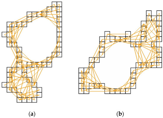 The two collections of distances, marked by the orange lines, within [i = 4, i+1 = 5) between the edge pixels are presented. (a) Edge of the chosen target inclusion with htarget(4)=95 connections; (b) Edge of the related synthetic cluster with h(4) = 87 connections. Only the edge pixels affecting the value of the related interfaces are sketched. Both clusters have area = 143 and interface = 76, so their shape index q ≅ 0.157 (the definition of q used is given in the text).