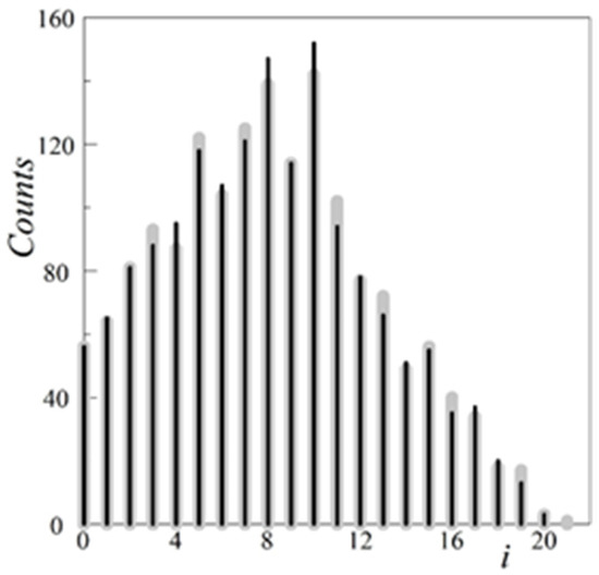 The histograms of linear distances between the edge pixels, htarget(i), the drop black lines, and h(i), the drop gray lines, for the chosen target inclusion Figure 2a, and the related synthetic cluster from Figure 2b, respectively. The common value htarget(i = 0) = h(i = 0) corresponds to the number of the edge pixels.
