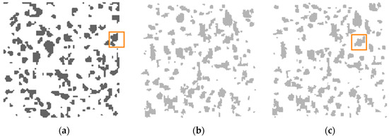 Now, we are ready to begin the second stage of the statistical reconstruction process. Using the SA program developed directly for clusters, we obtain an optimized microstructure corresponding to the first appearance of such a value of the cost function given by Equation (4), which ensures adequate reconstruction accuracy, as shown in Figure 4c. For our purposes, the appropriate tolerance value δ = 7 × 10−5 is sufficient to obtain the energy value Εfinal = 6.7 × 10−5 < δ. In addition, two small frames (the orange online) focus our attention on a certain compact inclusion in Figure 4a and its corresponding synthetic cluster, as shown in Figure 4c.