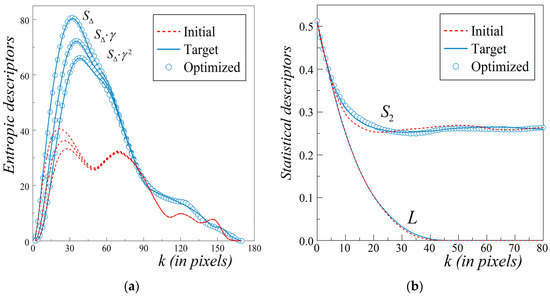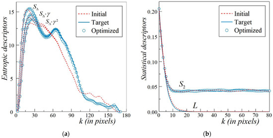 The quality of TSR is confirmed by Figure 7a,b. A comparison of the extended entropic descriptors {SΔ(k)γ α(k)} with α = 0, 1 and 2 for the target pattern (Figure 6a, the solid lines) with those for the optimized microstructure (Figure 6c, the open circles) is presented in Figure 7a.
