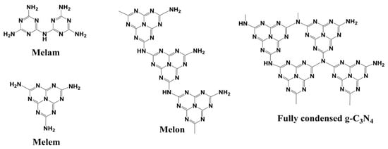 Structures of melam, melem, melon, and fully condensed graphitic carbon nitride.
