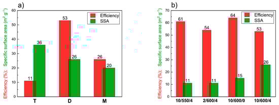 As follows from Figure 2a, the precursor that gives the product of the largest SSA provides the product with the lowest efficiency. When considering commercial applications of carbon nitride, the issue of synthesis efficiency should be a decisive factor. A reasonable compromise between the efficiency and SSA is the product obtained using dicyandiamide; the efficiency of 53% is economically justified, while the SSA of 26 m2 g−1 is acceptably large. Therefore, in further studies, the product obtained from dicyandiamide as a precursor was used to check the effect of the rate of temperature increase, target temperature and time of annealing on its properties. Figure 2b illustrates the impact of the conditions of synthesis on the efficiency and SSA of carbon nitride. For lower temperature of condensation (10/550/4) and the shorter time of annealing (10/600/0) the efficiency of the product is high, of 61% and 64%, respectively. Unfortunately, the SSA of the products obtained in these conditions is very low, of 11 and 15 m2 g−1, respectively. Increase in the temperature of synthesis from 550 to 600 °C gives a small decrease in the efficiency, from 61 to 53%, but an almost twofold increase in SSA, from 11 to 26 m2 g−1. A similar effect is observed if the time of annealing is increased from 0 h to 4 h, the efficiency decreases from 64% to 53%, while SSA increases from 15 to 26 m2 g−1. A similar effect of decreasing SSA with increasing temperature was observed by Papailias et al. [38].