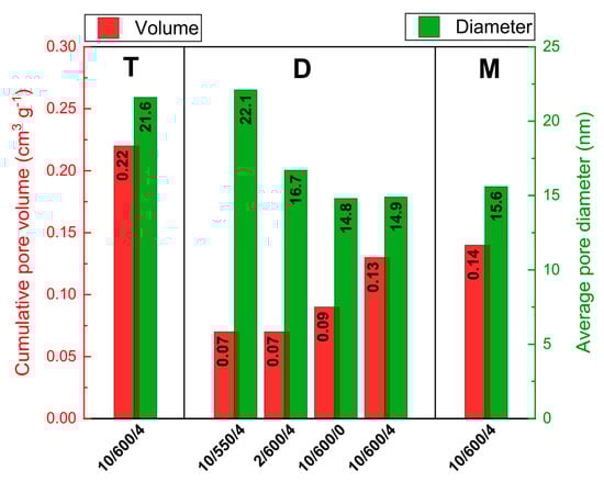 Besides SSA, also the porous structure of the product is important. It can be characterized by the low-temperature nitrogen sorption isotherms. According to IUPAC classification, the isotherms of N2 adsorption/desorption of all synthesized samples of carbon nitride are of IVa type, characteristic of mesoporous materials, Figure S1. The shape of the hysteresis loop indicates the presence of slit shaped pores of nonuniform shape and sizes, characteristic of pores open at two ends or partly closed [22]. Based on the Barret–Joyner–Halenda theory (BJH), the pore size distributions were obtained, Figure S2, which permitted calculation of the average pore size and cumulative pore volume, Figure 3.
