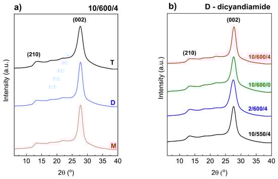 At first sight, the differences between diffractograms of the g-C3N4 samples obtained in different conditions and from different precursors are slight. However, careful analysis reveals differences in the positions and full width at half maximum (FWHM) of the reflection from the (002) plane. The position of this reflection changed from 27.50° 2θ for D-2/600/4 to 27.76° 2θ for M-10/600/4 (Table S2). In the diffractograms of the samples condensed at 600 °C this reflection is shifted towards higher angles 2θ. It is known that higher angles correspond to smaller interplanar distances, Figure 5a.