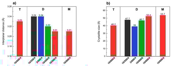 The shortest distance, of 3.21 Å, indicating the highest degree of condensation and ordering of carbon nitride, was obtained for the samples obtained from dicyandiamide and melamine condensed in the conditions 10/600/4. The samples obtained at the lower temperature of synthesis, lower rate of temperature increase, and short time of annealing are characterized by a lower degree of condensation, as evidenced by greater interplanar distances (3.22–3.24 Å). It has been reported that the single layers in bulk g-C3N4 are undulated, but could be planarized by heating at elevated temperature, which results in a denser stacking [43,44]. In the samples we studied, the heating at 600 °C should lead to a denser packing and thus shorten the interlayer distance. In the layer structure of carbon nitride, the size of crystallites calculated from the Scherer formula corresponds to the number of condensed layers. According to Figure 5b it is smaller for the samples obtained from thiourea than in those obtained from dicyandiamide and melamine. As follows from our results that the higher condensation temperature and longer time of annealing at 600 °C lead to increased size of crystallites so also increased number of condensed layers.