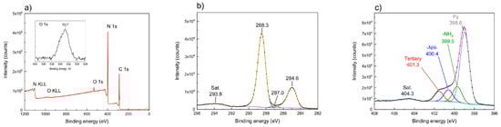 Figure 7 presents exemplary XPS spectra of the sample M-10/600/4. The survey spectrum (Figure 7a) of M-10/600/4 showed that the sample was composed solely of C, N, and O, which may have originated from adsorbed water molecules [40,47,48,49]. The XPS spectra of the samples of carbon nitride obtained from dicyandiamide and thiourea were similar. For the sample obtained from thiourea, no signal from sulfur (S 2p) was detected, which means that the whole sulfur was removed upon thermal condensation
