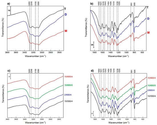The FTIR spectrum recorded is practically identical to that reported by Lotsch and Schnick [58] for carbon nitride obtained by thermal decomposition of tricyanomelaminate salts at 350 °C and to that of melon is presented [40]. Detailed analysis of the FTIR spectra permits observation of certain subtle differences in the structure of carbon nitride samples obtained from different precursors in the 10/600/4 (Figure 8a,b) conditions. The FTIR spectrum of the sample obtained from thiourea shows bands of higher intensity than those in the spectra of the other two samples, D and M. A higher intensity of the bands assigned to the stretching vibrations N−H (3350–3000 cm−1) indicates a greater contribution of −NH2 and −NH− groups in the sample T. As suggested by some authors [45], the structure of carbon nitride should be described by the CxNyHz formula rather than C3N4. The differences in the spectral range of 1700–1200 cm−1 are small, so we are inclined to support the thesis that irrespectively of the precursor, using the same conditions of condensation the samples of carbon nitride obtained have practically the same structures. Figure 8c,d presents the FTIR spectra of carbon nitride samples obtained from dicyandiamide in different thermal conditions. The structure of the bands is very similar in the spectra of all four samples. However, the spectra of samples D-10/550/4 and D-2/600/4 are characterized by somewhat greater intensity than those of the samples T and M. This observation is rather surprising as it contrasts with the expected similarity of the spectra of samples obtained in the conditions 10/600/4 and 2/600/4. It means that the rate of temperature increase must be also important. It was reported that the melon undergoes gradual depolymerization already at 570–600 °C [56]. Thus, it can be supposed that the contribution of long melon chains in the samples synthesized at the higher temperature is smaller.