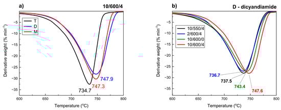 The effect of thermal conditions of synthesis on the stability of the samples studied can be analyzed for the sample carbon nitride obtained from dicyandiamide, Figure 9b. The differences in stability are not significant and reach about 10 °C. In general, the higher rate of temperature increase in the synthesis and the longer time of annealing are conducive to increasing thermal stability of carbon nitride. The highest thermal stability was found for D-10/600/4.