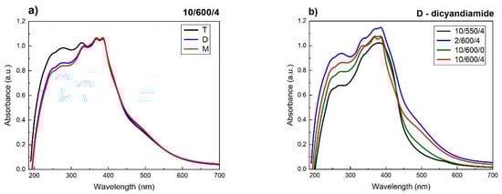 The UV–vis spectra of the samples studied (Figure 10) are typical of carbon nitride and show the characteristic band in the range of 190–450 nm corresponding to aromatic systems. The UV–vis spectra of all samples reveal two inflection points. The first, at about 250 nm, corresponds to the transitions π → π* in aromatic rings, while the second at 380 nm indicates the π* transitions corresponding to the electron transfers from the nonbonding nitrogen orbital to the antibonding aromatic orbitals. The higher absorbance of radiation was observed for the samples obtained from thiourea, which is related their larger SSA and hence greater possibilities of photon harvesting. The UV–vis spectra of the samples obtained from dicyandiamide and melamine, in the conditions 10/600/4 (Figure 10a) are almost identical. Some differences appear to be generated by different conditions of condensation, Figure 10b. For the samples synthesized at the higher temperature and in the longer annealing time, the edge of absorption is shifted towards longer wavelengths, which means that the band gap decreases.