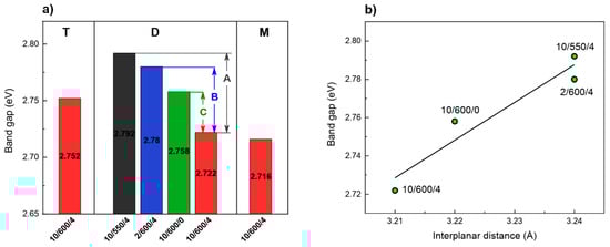 The band gap reduction is correlated with decreasing interplanar distance (Figure 11b). The interplanar distance decrease by 1% results in a band gap decrease by over 2.5%. Our observations are in agreement with the results reported by Zuluaga et al. [63].