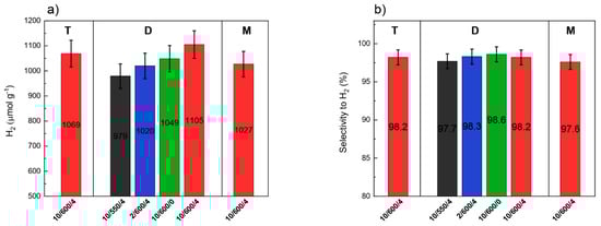 The samples of carbon nitride obtained from different precursors and in different conditions were tested in the photocatalytic decomposition of water-methanol solution to hydrogen. The minor products were carbon monoxide and methane. Figure 12a presents the photocatalytic activity of the carbon nitride samples studied after 4 h of the reaction, while Figure 12b gives the selectivity towards hydrogen. Dependences of hydrogen, methane, and carbon monoxide yields on the irradiation time over all investigated photocatalysts are displayed in Figure S3. The formation of hydrogen is decreasing in order: D-10/600/4 ˃ T-10/600/4 ˃ D-10/600/0 ˃ M-10/600/4 ˃ D-2/600/4 ˃ D-10/550/4 (Figure 12a). Observed differences in hydrogen selectivity are small and do not exceed 1% (Figure 12b). In general, the photocatalytic activity of photocatalysts is known to depend on the specific surface area, particle size, light absorption, recombination rate of photogenerated electron–hole pairs, and so on [65,66].