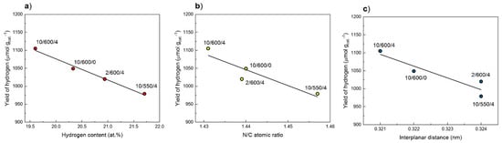 Correlation between the yield of hydrogen in the water-methanol photocatalytic oxidation under inert atmosphere and hydrogen content determined by EA (a), and N/C atomic ratio by EA analysis (b), and interlayer distance calculated form XRD patterns (c).