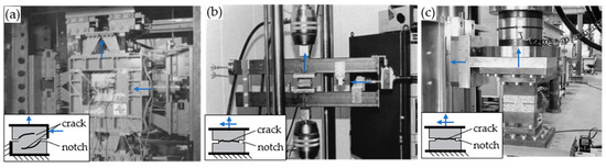 While crack propagation underlying mixed mode conditions can be observed in many practical problems (e.g., shear and punching). It is, however, challenging to experimentally isolate the pertaining effects for characterising adequate constitutive relations for a mixed mode fracture. Since the required test setups are material consuming and massive in order to provide sufficient stiffness for analysing mixed mode characteristics in concrete, only a few experimental studies are documented. Significant contributions to the understanding of mixed mode fracture in concrete were made by Hassanzadeh [19] (1992) and Nooru-Mohamed [20] (1992). Their test setups are illustrated in Figure 2a,b.