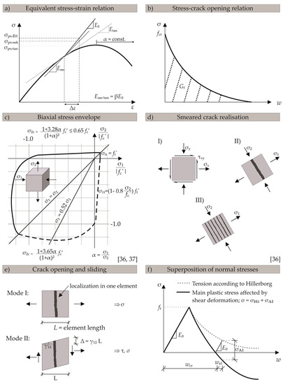 This key concept of FRCM (cf. Figure 4) is realised via superposition of the resulting tensile stresses of mode I, according to Hillerborg, and mode II, according to aggregate interlock models (cf. Equation (11)).