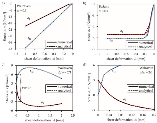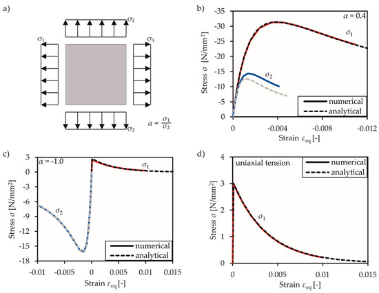In case of compression-tension and uniaxial tension (cf. Figure 6c,d), there was no difference between the numerical and analytical solutions. This can be explained by the early stage of reaching the maximum tensile strength fct, as long as the material behaviour remains linearly elastic.