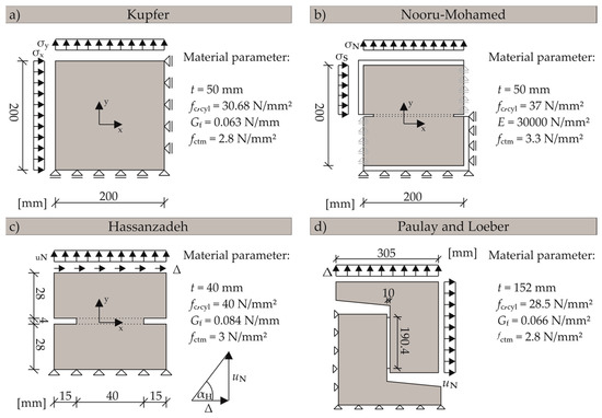 Illustration of the numerical boundary conditions and the material parameters, (a) Kupfer et al. [41], (b) Nooru-Mohamed [20], (c) Hassanzadeh [19] and (d) Paulay and Loeber [10].