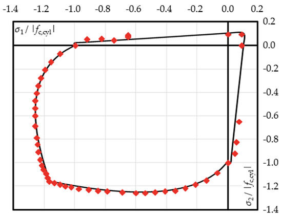 This is due to the minimum compressive strength of 0.65⋅fc,cyl according to Darwin and Pecknold’s [36] modified strength envelope (cf. Figure 5c), which acts like a lower limit of 65% of uniaxial compressive strength for increasing tensile stress while the tensile strength increases for decreasing compressive stresses. Besides the consequently increased numerical stresses at σ1/fc,cyl = −0.65, perfect correspondence to the modified strength envelope can be recognised.
