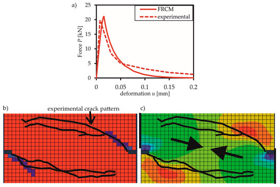 Illustration of (a) numerical force-deformation curve for load path 0, (b) numerical crack pattern illustrated with the damage parameter β for the elasticity modulus, and (c) numerical main stress condition. All were compared to the experimental results of Nooru-Mohamed [20] by using Walraven’s [13,14] aggregate interlock model.
