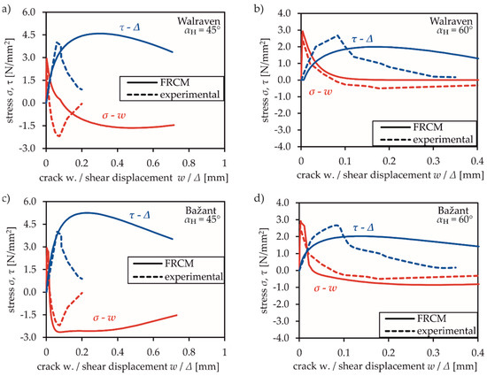 Figure 11 illustrates the normal stress over the crack opening and the shear stress related to the shear deformation for FRCM using the empirical approach by Walraven [13,14] (cf. Figure 11a,b) and the rough crack model by Bažant [12] (cf. Figure 11c,d). In principle, reasonable agreement can be observed in all diagrams. The deviations are due to inappropriate constitutive relations of crack friction for concrete mixes with small grain sizes. On the one hand, FRCM with Walraven’s material model considers larger maximum aggregate diameters leading to higher transferred stresses in the crack even at large crack widths. This might be the reason for the overestimation of shear and normal stresses in Figure 11a with a significant shear component (αH = 45°). On the other hand, a larger slip occurs due to the larger aggregates and, consequently, larger shear deformations are required to obtain shear stresses. Thus, in tests with dominant mode I deformation of crack surfaces (e.g., Figure 11b, αH = 60°) and small shear deformation, this effect leads to an underestimation of the transferable stresses.